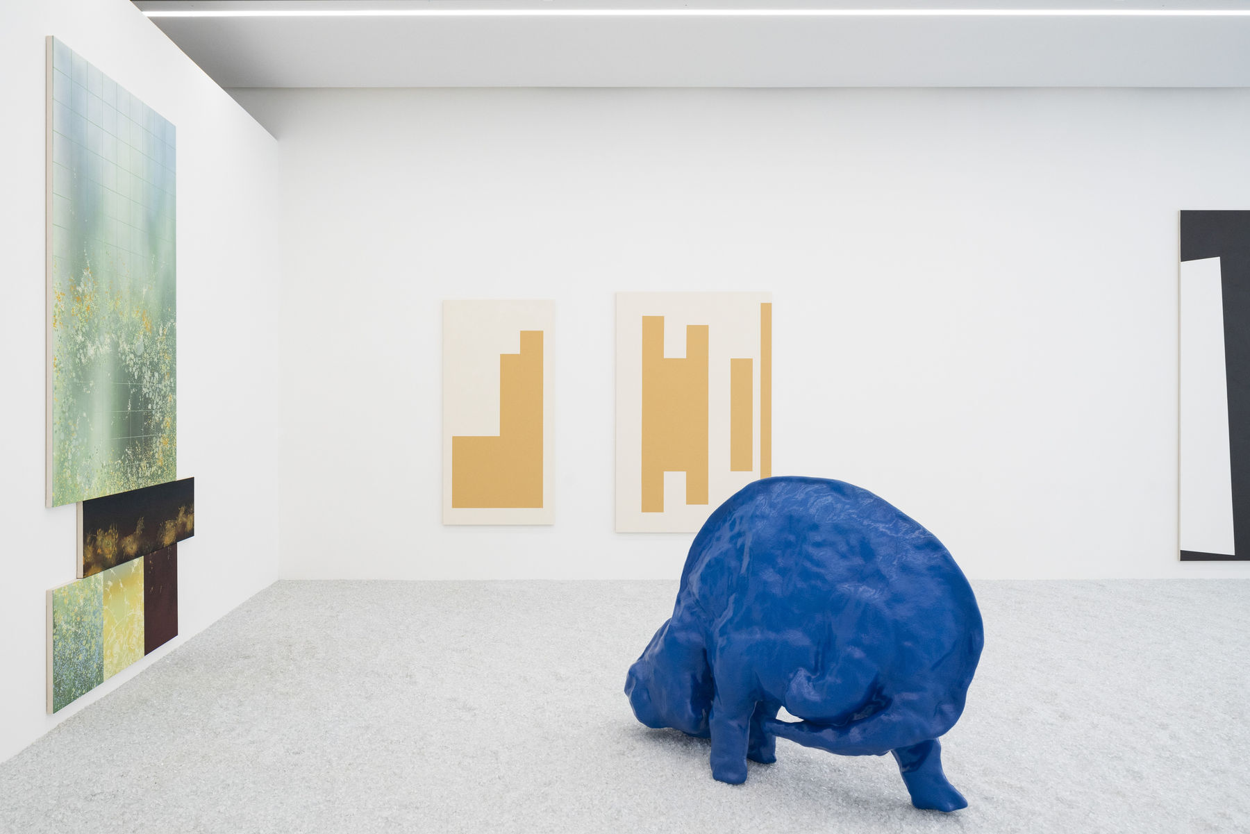 DENIS SAVARY (*1981) uses a fairly broad range of mediums that runs from drawing and sculpture to installation and video art. In one register that is all quotation and allusion, Savary references both art history (most often Surrealism) and the field of literature, playfully grounding his work in a hybrid- isation of sources as well as genres and techniques. Shunning all hierarchies, the artist relies on craftsmen and technicians to produce his pieces, thus valorising a manufactured output in favour of the show as a work of art in and of itself. For this museum project, the series of anteaters called Bugatti, I, II, III takes up a recurring subject in the artist’s practice, i.e., animal sculp- ture. Here Savary is referring to the Bugatti dynasty: Carlo, the father who designed and produced animal-like Art Nouveau furniture, and his two sons, Rembrandt, an animal sculptor, and Ettore, the creator of the famous make of automobiles that bears the family name1. Savary sees in these three figures “something like a portrait and mirror of his practice”. And indeed, all of them are drawn to the fantasy genre and are interested in an industrial look in their respective outputs. The blue Savary has chosen is a nod to the emblematic models of the brand and making the pieces out of fibreglass allows him to turn out numerous variants while suggesting the strange animal’s movements. Among the many iconographic sources the artist considered for this series, one could mention a famous 1969 photograph of Salvador Dalí coming out of the Gaîté Station of the Paris metro with an anteater on a leash. Savary’s arrangement here recalls the ties of friendship that bound Dalí to André Breton in the 1930s, whom he called the “Great Anteater”, because of the phobia they both felt for ants. And, as in Savary’s practice as a sculptor, the importance of animals as objets trouvés in the Surrealist movement cannot be denied. In a similar register, Savary created the glass gravel surface which recalls the materialisation of the effects of weather in earlier shows. Flower of Fog, for example, was something between snow and fog. Borrowing its title from a drawing by Meret Oppenheim, who was also affiliated with the Surrealist movement, it conjured up our connection to the landscape, which is both physical and mental. This particular art material demystifies in a way the museum space in favour of a future territory. Moreover, Savary’s interest in vernacular objects from the domestic sphere, like the fireplace cover he once exhibited (Josy’s Club, 2023) springs from the same rejection of current aesthetic categories and the same desire to identify art with life. In this, he is approaching the neo-Dadaist spirit of Fluxus, an inescapable movement on the Swiss-French art scene since the 1970s, notably around the singular figure of John M Armleder.