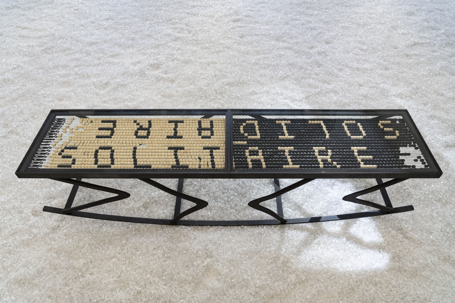 Over the course of group work sessions – which were both demanding and exhilarating – one idea came to the fore with absolute clarity, that of locating the future artworks in an invented landscape; today that notion serves as the narrative through line for the show. Conceptually, this means bouncing around the apparently simple idea of bringing together in one venue several practices while avoiding an overarching theme that is mere pretext – in order to suggest, and be open to, a pertinent experiment and experience in both visual and formal terms. Hence our decision to modify the size of the gallery, dividing it into two distinct spaces. There is a corridor designed to serve as a gap and existing as a prelude, an introduction to the program of the exhibition, which plays out in the main gallery. There the floor is covered with a transparent glass gravel that concentrates the show’s themes and, doing so, better conveys them, like a blank canvas stretched over a frame. Flashes of light from the translucent material, as much as the subtlety of the correspondences among the works hanging on the walls and displayed on the floor, reveal through their intensity an infinite number of perceptions that are similar to a mirage. Visitors’ walking around the show, like the sound of their steps in this fictional territory, renews the uncanny effect, inviting viewers to take a closer look and wander through the space once more.